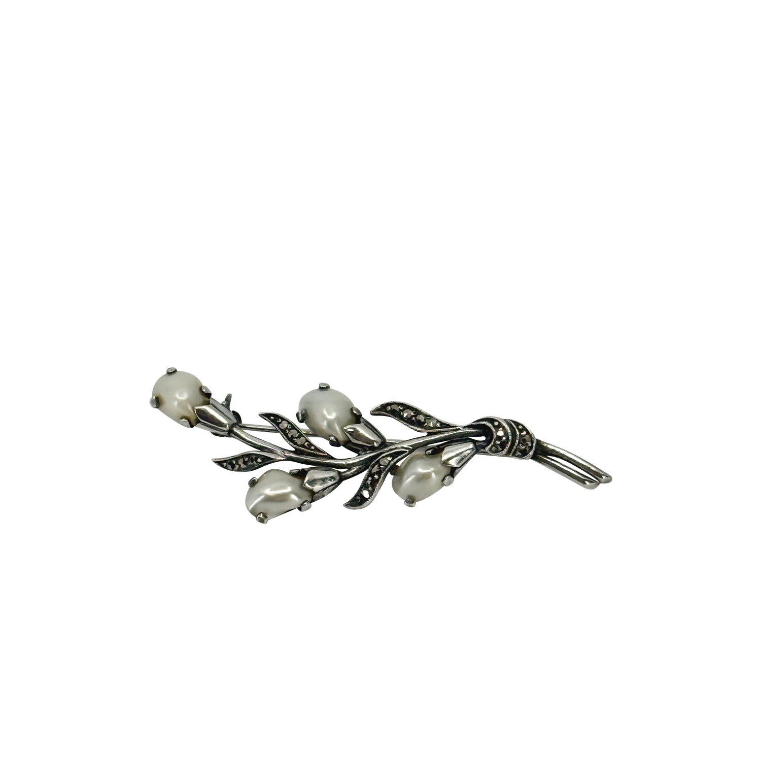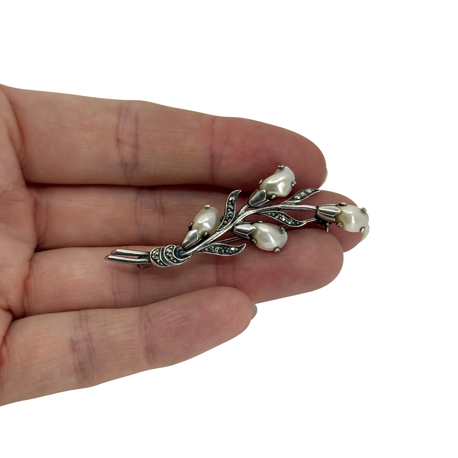 This is a lovely arts & crafts style freshwater river pearl, marcasite & sterling silver branch brooch.