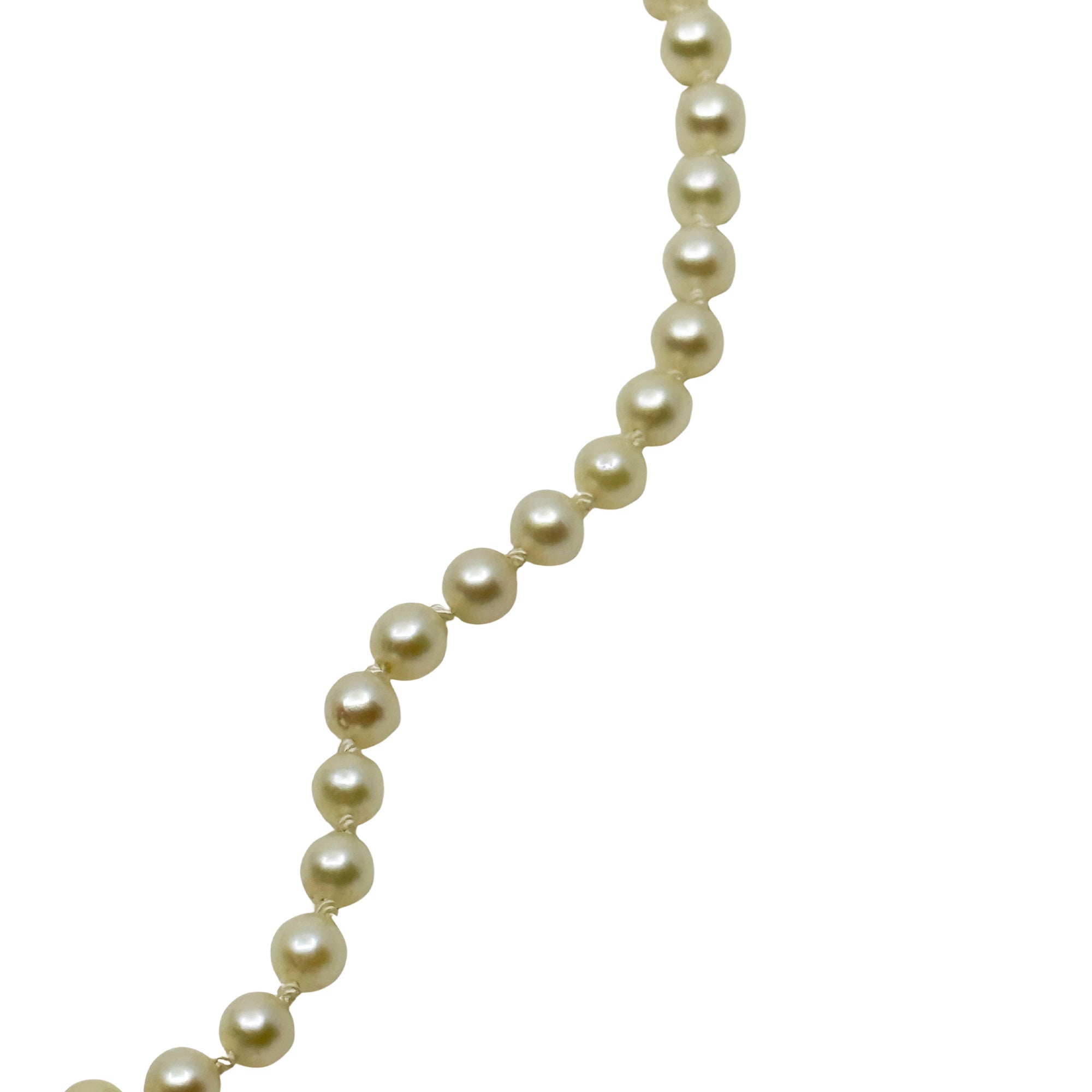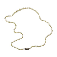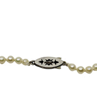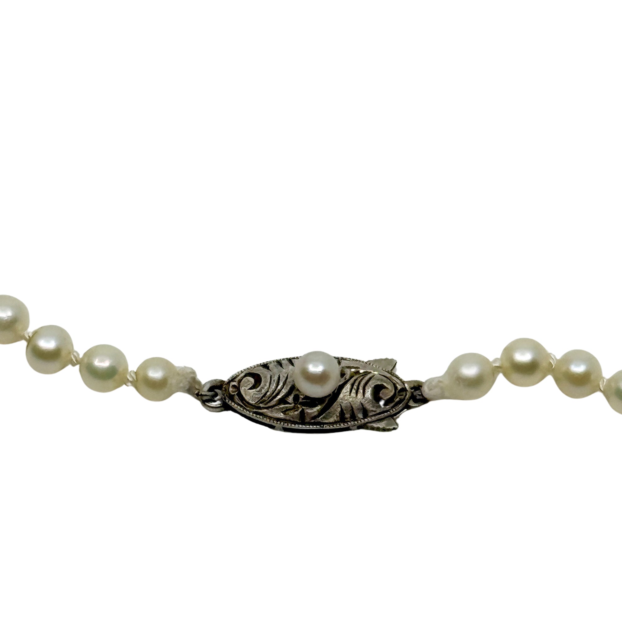Clasp is in solid sterling silver with a single pearl in the center. It is stamped "STERLING" for sterling silver. Total length is 21.50 inch. From mid-century or later.