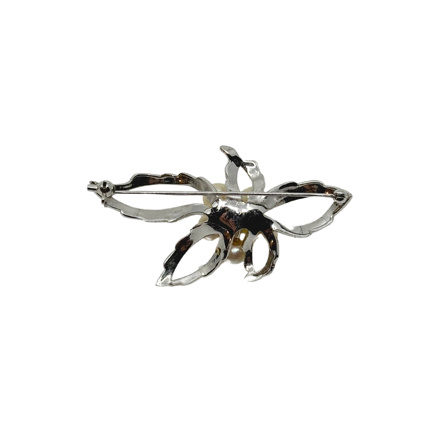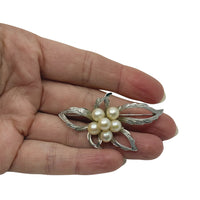 Vintage Engraved Leaf Japanese Saltwater Akoya Cultured Pearl Brooch- Sterling Silver