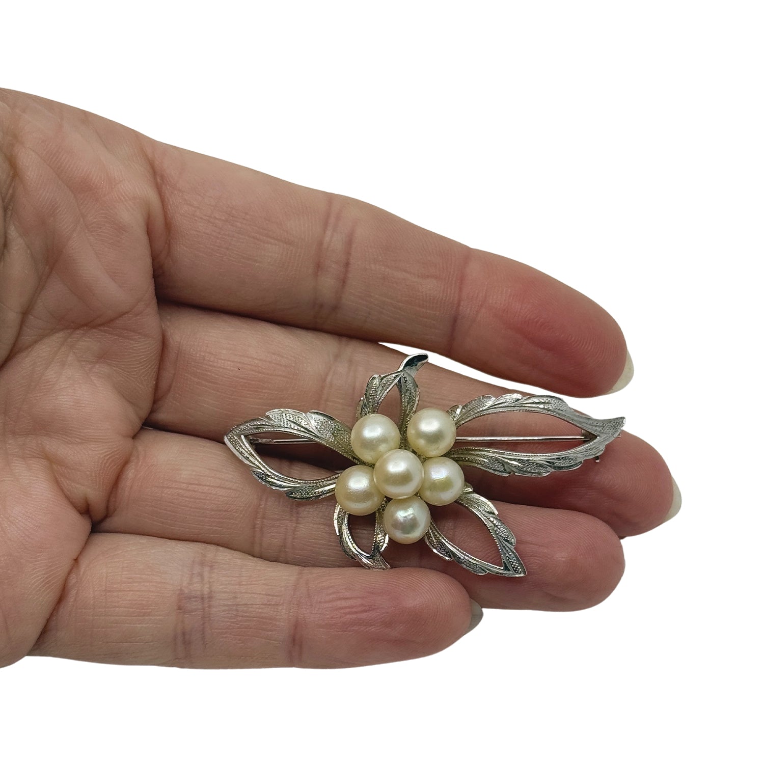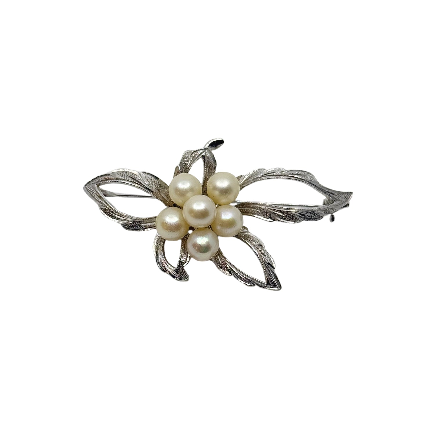 This is a lovely vintage mid-century textured leaf Japanese akoya saltwater cultured pearl brooch.