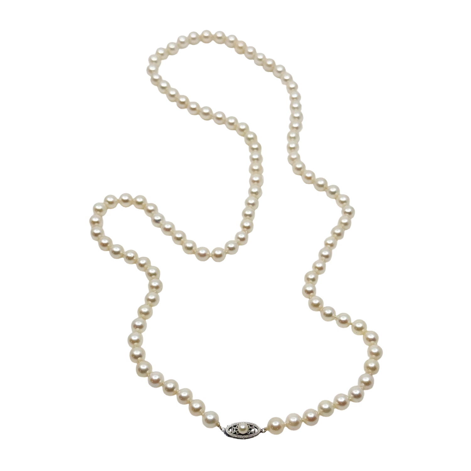 The clasp is solid 14K white gold and is a filigree style with a single pearl in the center. It is stamped "14K". Total length is 31.25 inch. From mid-century.