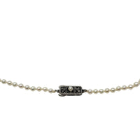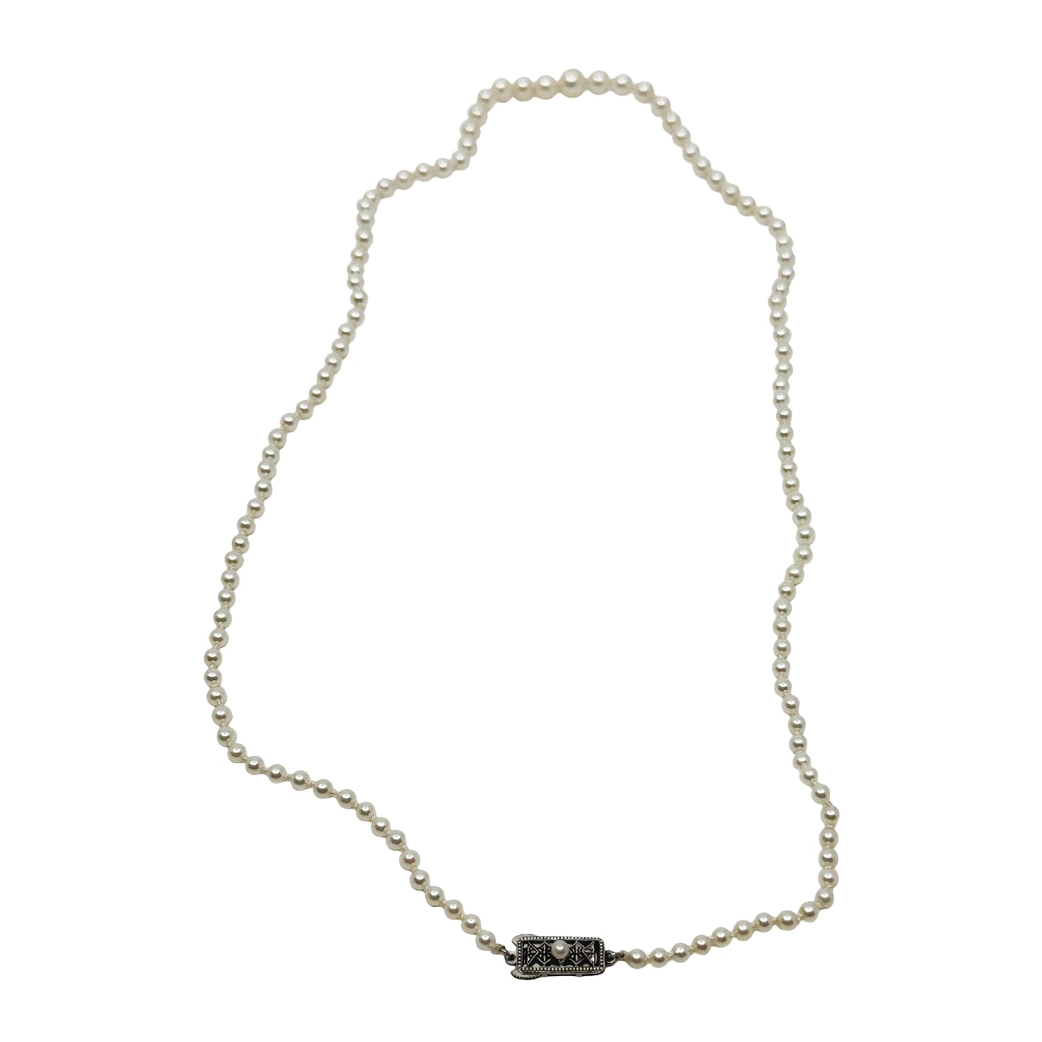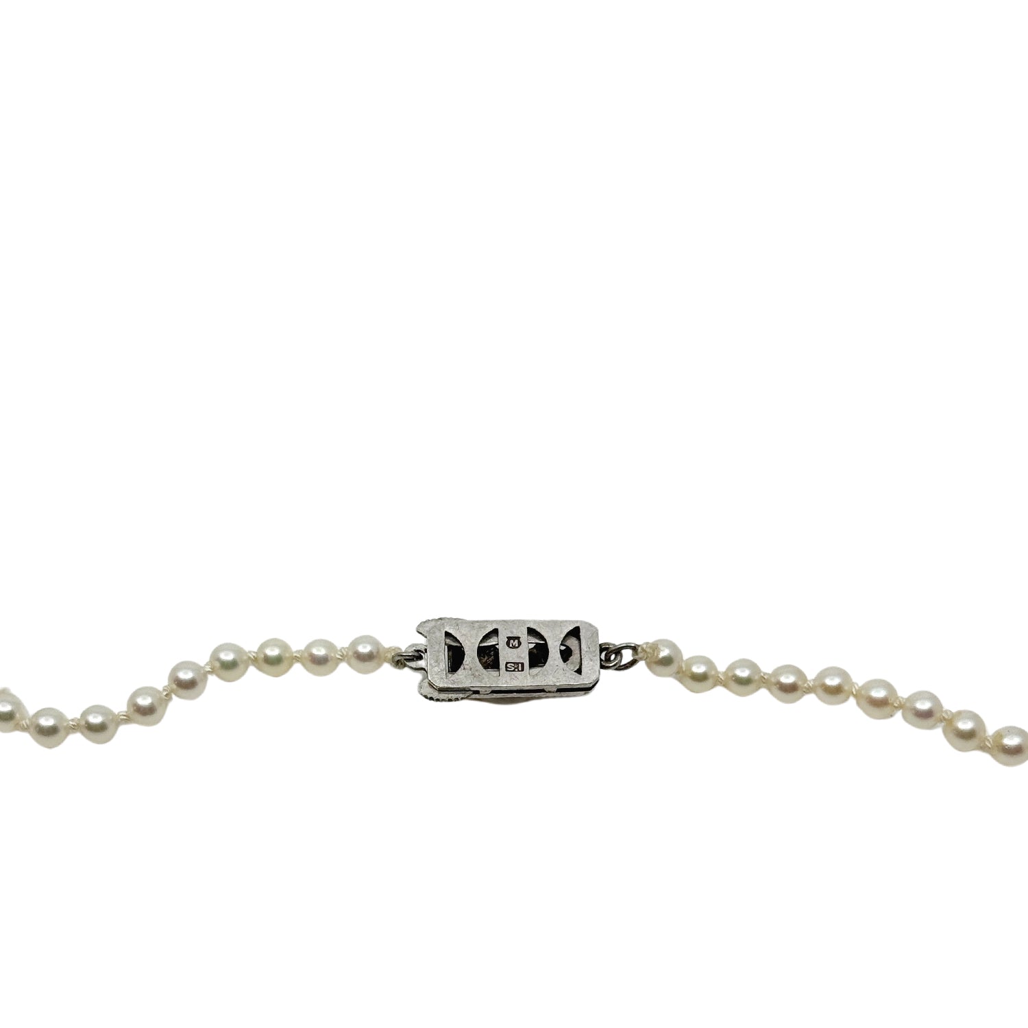Clasp is in solid sterling silver. It is stamped "SI" in a square for silver and a large"M" in a clamshell for Mikimoto. It is detailed with beading and a single pearl in the center. Total length is 21.25 inches. From mid-century Japan.