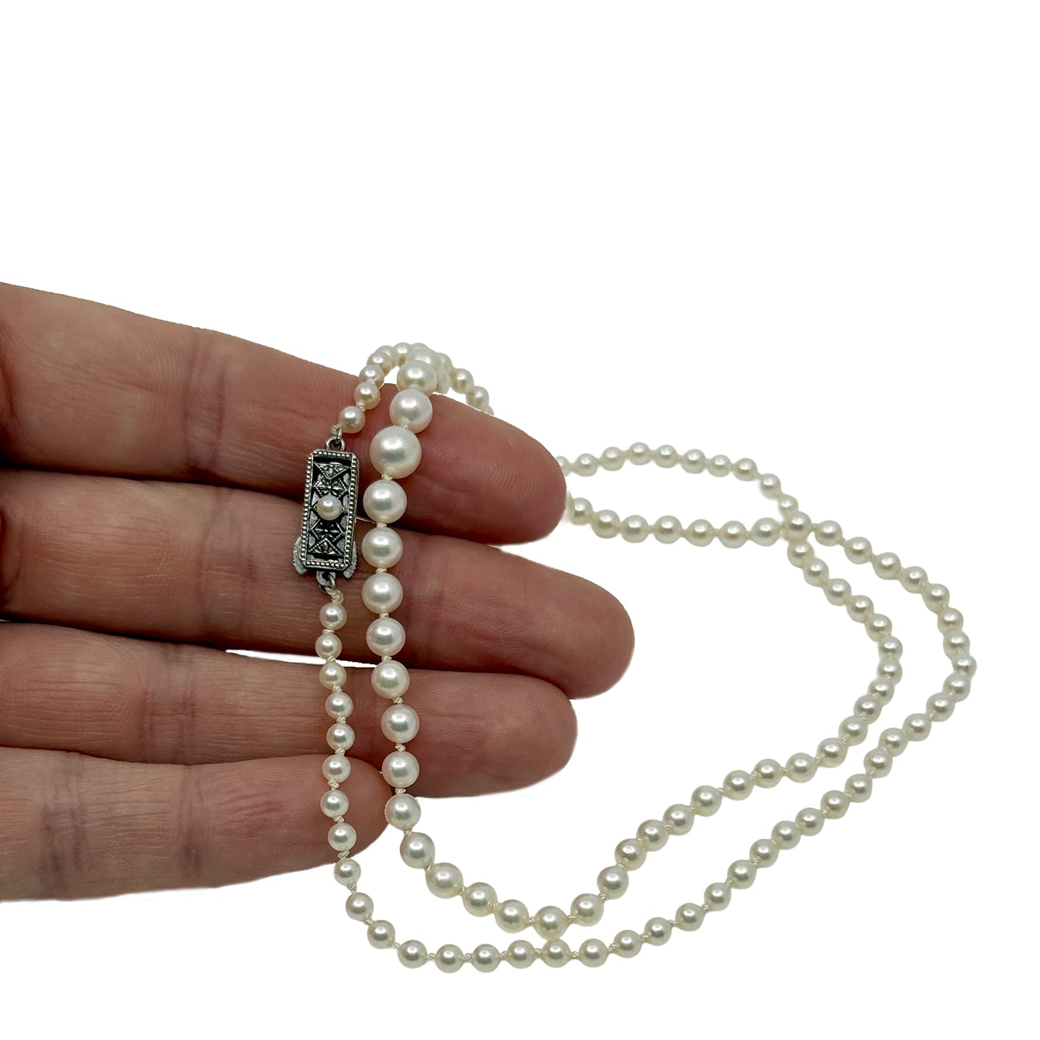 This is a petite strand of vintage graduated Mikimoto saltwater akoya cultured pearls.