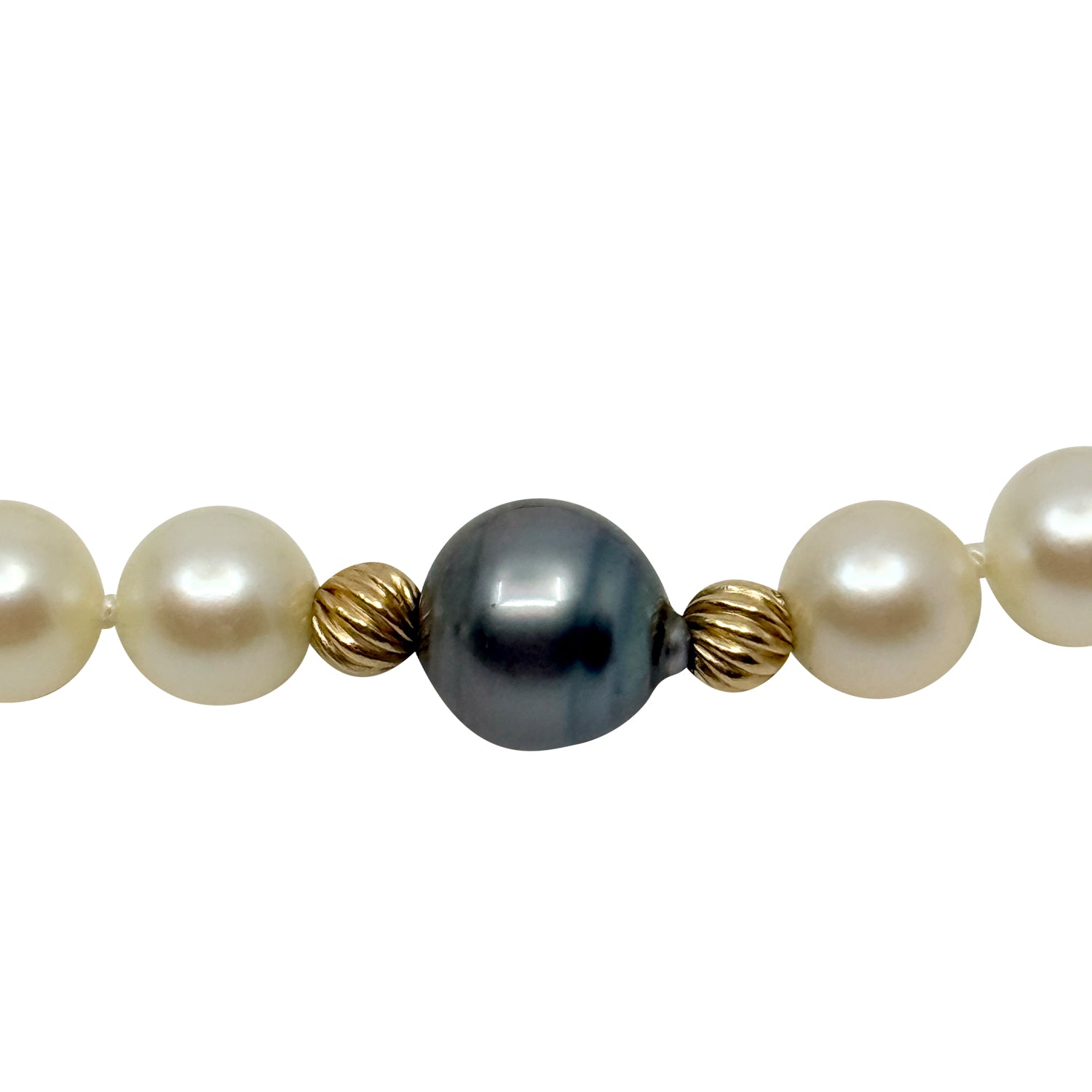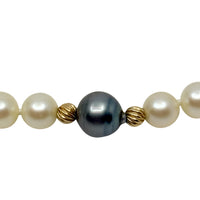 The black pearl measures 8.50mm and is a gray/black color with good luster. The white pearls measure 6.50-6.75mm with great luster and pink overtones. The center pearl is separated from the white pearls by two solid gold spacer beads.