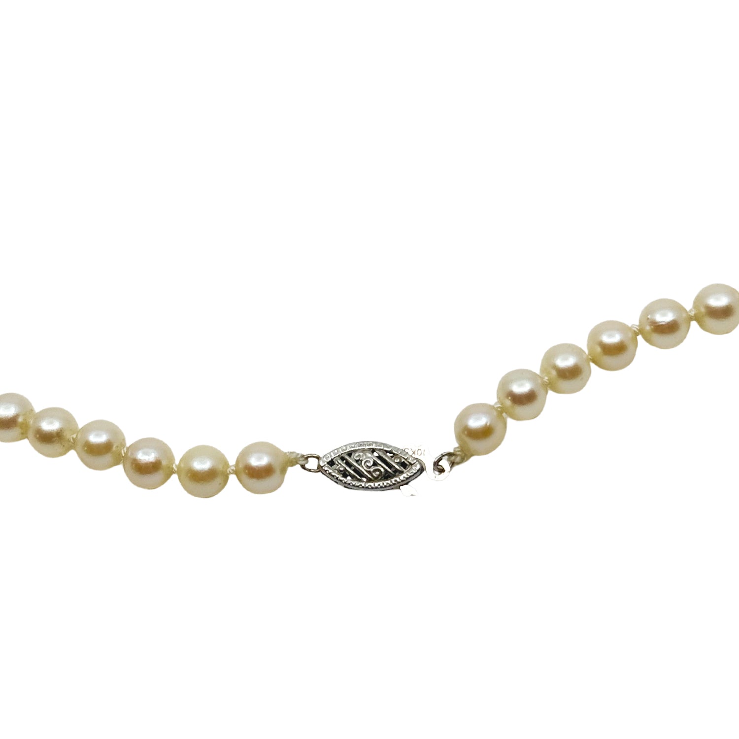 The clasp is solid 10K white gold and is a filigree style. It is stamped "10K". Total length is 17 inch. From mid-century.