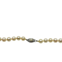 The clasp is solid 14K white gold and is a filigree style with a single 3.50mm pearl in the center. It is stamped "14K". Total length is 23.25 inch. From mid-century.