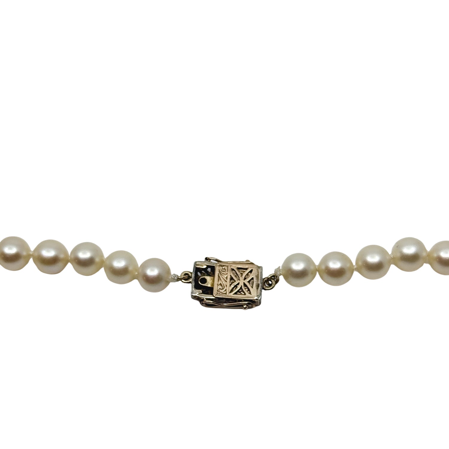 The pearls range from 7.00-7.50mm. They have high luster with light rosy pink overtones. Good quality, well matched white strand.