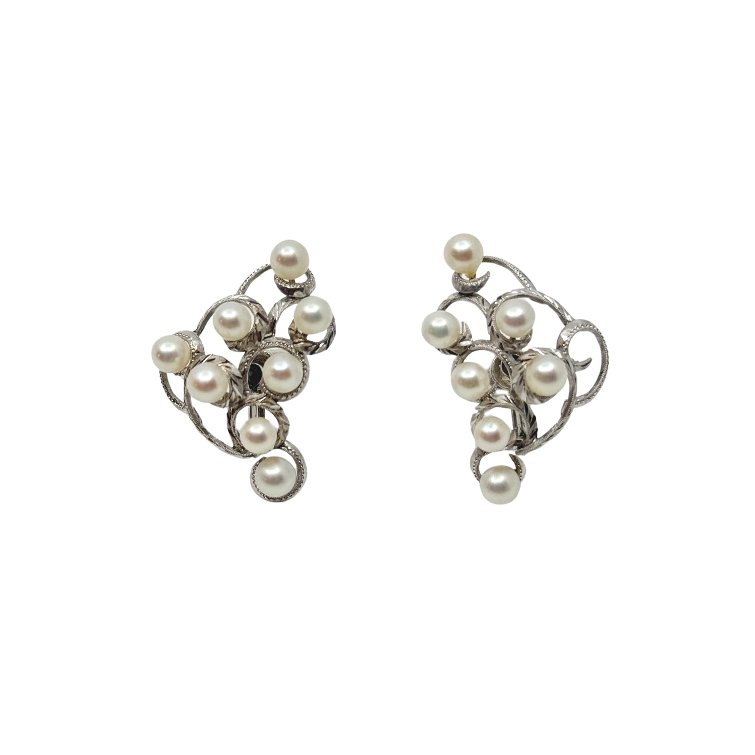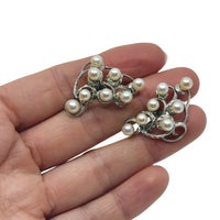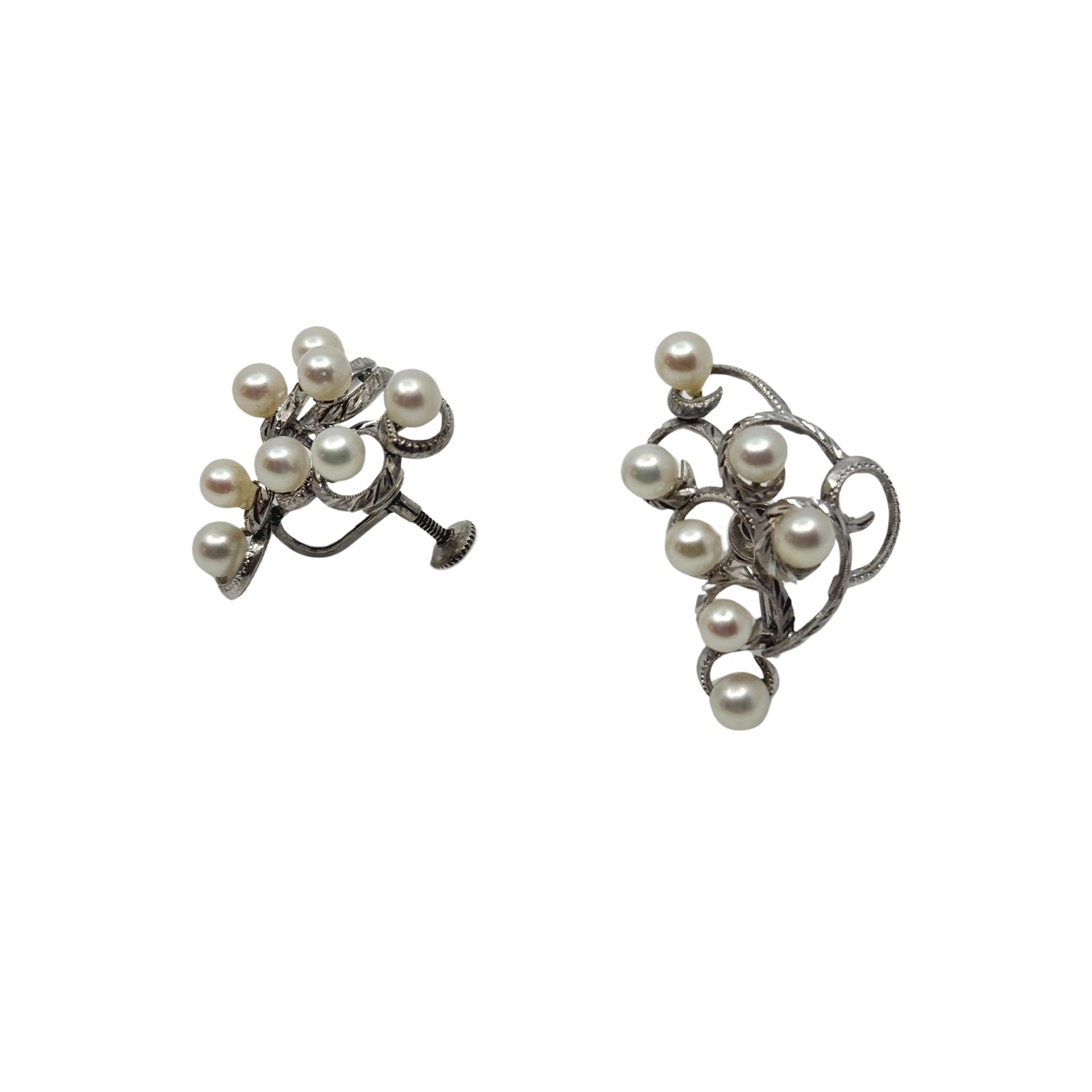 Pearls are set in a swirling design with hand engraving and milgrain. They are stamped "STERLING" for solid sterling silver. The earrings measure 1 1/4 inch long. From Japan 1950's-1980's.