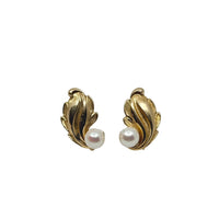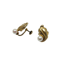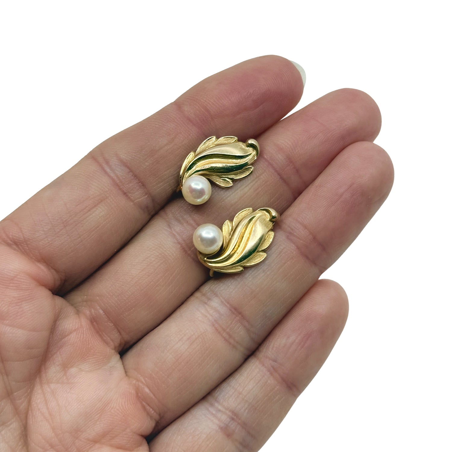 Mid Century Leaf Japanese Akoya Saltwater Cultured Pearl Screwback Earrings- 10K Yellow Gold